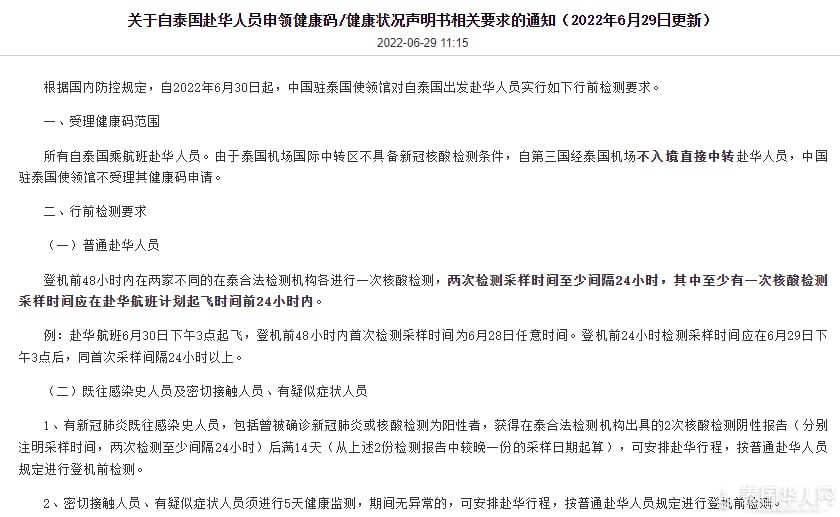 根据国内防控规定,自2022年6月30日起,中国驻泰国使领馆对自泰国出发赴华人员实行如下行前检测要求。 一、受理健康码范围 所有自泰国乘航班赴华人员。由于泰国机场国际中转区不具备新冠核酸检测条件,自第三国经泰国机场不入境直接中转赴华人员,中国驻泰国使领馆不受理其健康码申请。 二、行前检测要求 (一)普通赴华人员 登机前48小时内在两家不同的在泰合法检测机构各进行一次核酸检测,两次检测采样时间至少间隔24小时,其中至少有一次核酸检测采样时间应在赴华航班计划起飞时间前24小时内。 例:赴华航班6月30日下午3点起飞,登机前48小时内首次检测采样时间为6月28日任意时间。登机前24小时检测采样时间应在6月29日下午3点后,同首次采样间隔24小时以上。 (二)既往感染史人员及密切接触人员、有疑似症状人员 1、有新冠肺炎既往感染史人员,包括曾被确诊新冠肺炎或核酸检测为阳性者,获得在泰合法检测机构出具的2次核酸检测阴性报告(分别注明采样时间,两次检测至少间隔24小时)后满14天(从上述2份检测报告中较晚一份的采样日期起算),可安排赴华行程,按普通赴华人员规定进行登机前检测。 2、密切接触人员、有疑似症状人员须进行5天健康监测,期间无异常的,可安排赴华行程,按普通赴华人员规定进行登机前检测。 三、关于检测机构及报告要求 (一)泰国合法检测机构出具的核酸检测证明均可接受。为方便广大申请者,中国驻泰国大使馆领区内推荐检测机构信息如下: http://th.china-embassy.gov.cn/chn/sgxw/202206/t20220607_10699576.html 其他总领馆推荐检测机构信息详见中国驻清迈、宋卡、孔敬总领馆网站。 (二)申请人须持本人有效身份证件前往检测机构现场进行采样,核酸检测须通过鼻咽拭子采样,核酸检测报告须用英文出具并明示RT-PCR等字样。 四、申请健康码/健康状况声明书 (一)申请方式 1、中国公民(含持中国护照、旅行证、港澳居民来往内地通行证、台湾居民来往大陆通行证人员):通过微信搜索“防疫健康码国际版”或扫描以下二维码,进入微信防疫健康码国际版小程序,填报提交并申请健康码。 2、非中国公民:通过外国人健康状况声明书二维码网页申请,请点击https://hrhk.cs.mfa.gov.cn/H5/ 进入。 (二)上传申请材料 1、全部检测报告 2、赴华机票或行程单 五、审核查验 (一)为保证检测报告质量,中国驻泰使领馆将联系检测机构对报告进行核查。申请人在获得检测报告后应第一时间提交健康码申请。在航班起飞前3小时内提交的申请,将可能无法及时获得检测机构确认,并影响申请人获取健康码,造成旅行受阻。 (二)申请人须上传真实、清晰、完整的检测报告,违规造假将导致申请健康码资格被暂停。 (三)航空公司将在值机现场同时查验健康码、核酸检测报告。 1、赴华人员现场打开、登录小程序,并展示动态健康码,不接受截屏图、打印版等其他健康码展示形式; 2、赴华人员出示核酸检测报告纸质版,结果为阴性人员方可登机。 中国驻泰国使领馆特别提醒,所有赴华人员务必做好自我健康监测,注意登机前及旅途中防护,防止因感染导致登机受阻、中转地滞留等情况。 |